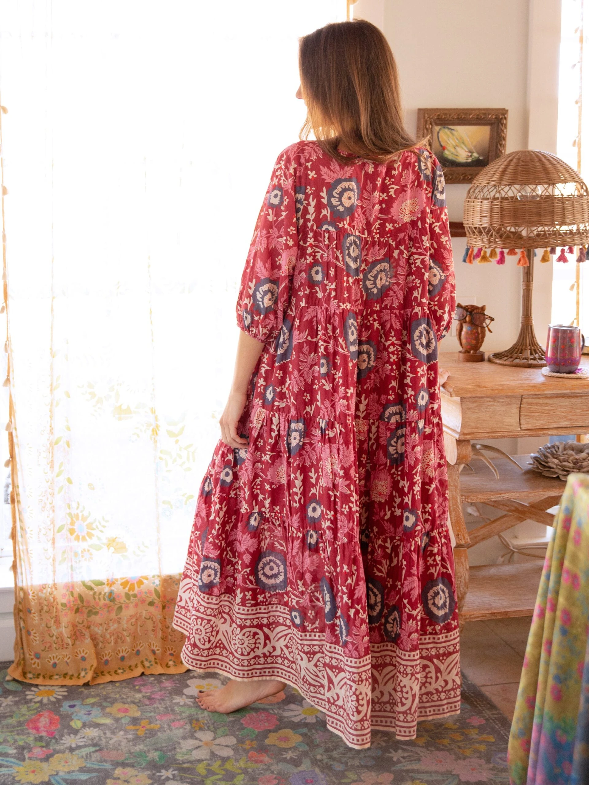 The Auguste Boho Maxi Dress is so relaxed & comfy! We love the puffed sleeves and whimsical floral tiers of soft cotton. In this dress, you can be comfortable curled up on the couch or visiting a new city. You’ll look like you put a lot of effort into your outfit, but you’ll be drawn to it simply because of its comfort and charm! Tie your tassels or leave them undone. If you don’t like an oversized look, just size down for a slimmer fit. Either way, you’ll look and feel beautiful in this bohemian inspired dress.