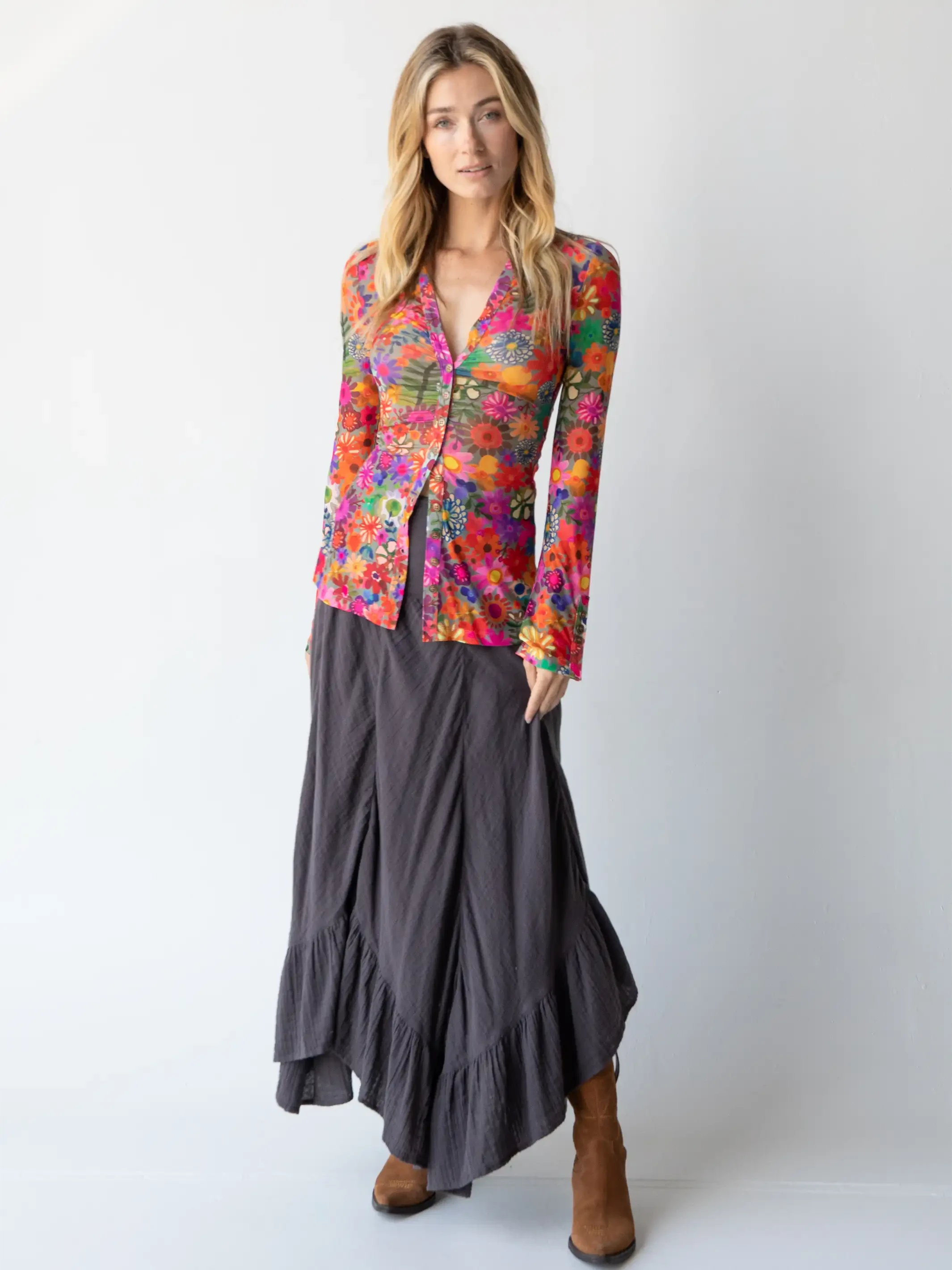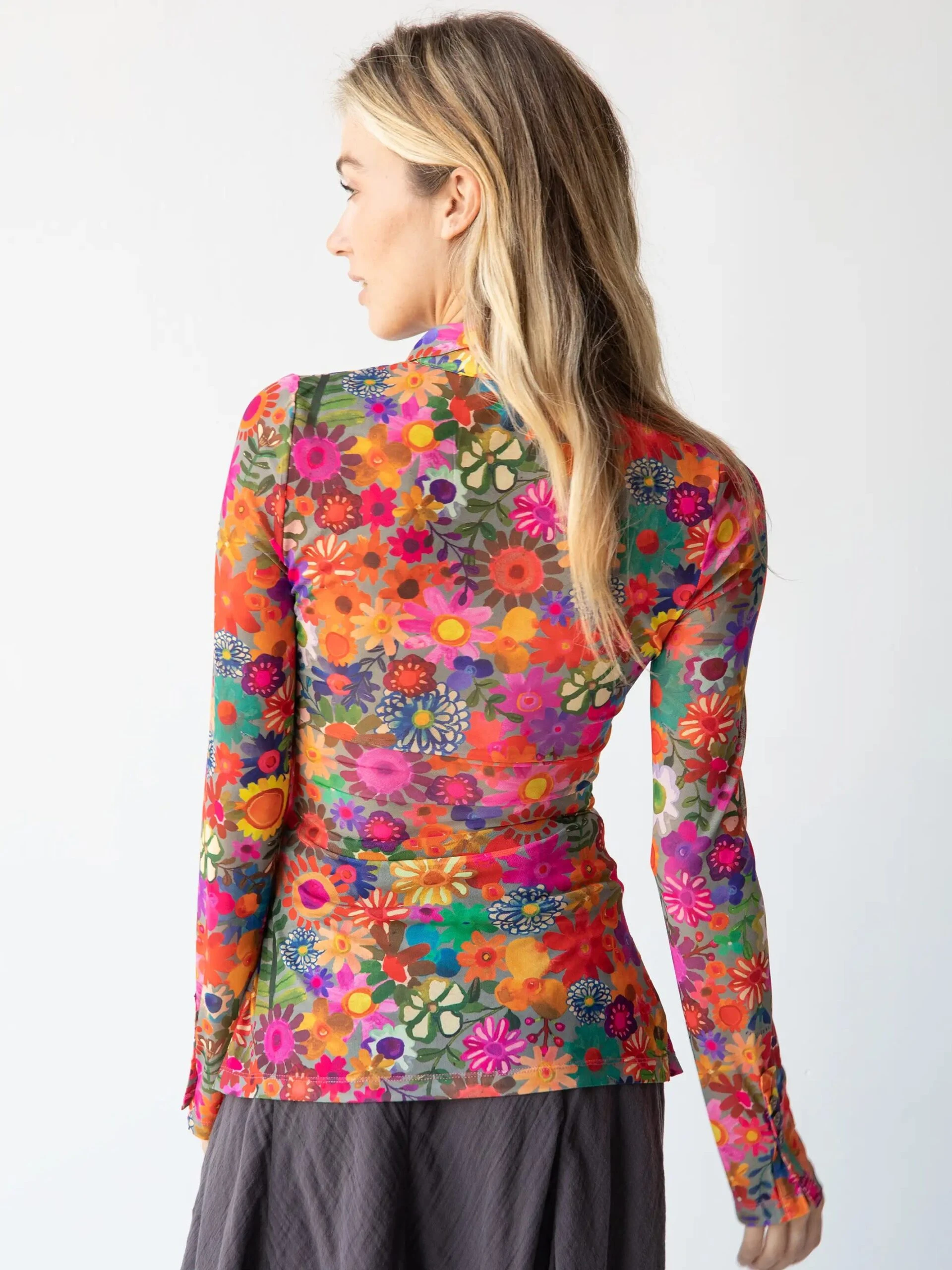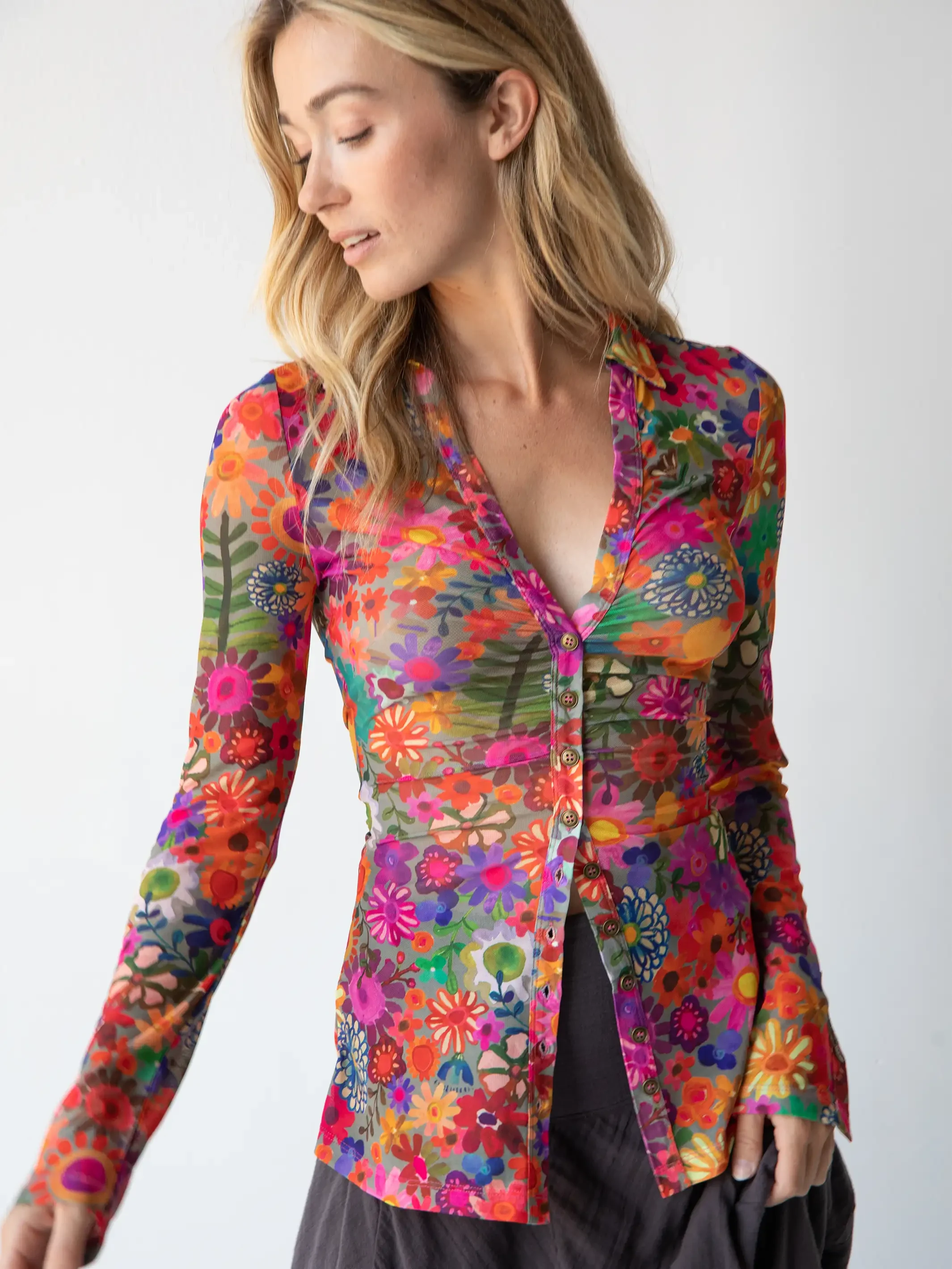Get your groove on in this retro-inspired top! With its floral designs and mesh fabric, the Carina Top is the perfect mix between elegant and edgy femininity. The buttoned front, ruching at the center, and bell-shaped fit are designed to create the most flattering silhouette for your body type. This fun top is made for you to embrace your free-spirited self and add a vibrant vintage touch to your wardrobe!