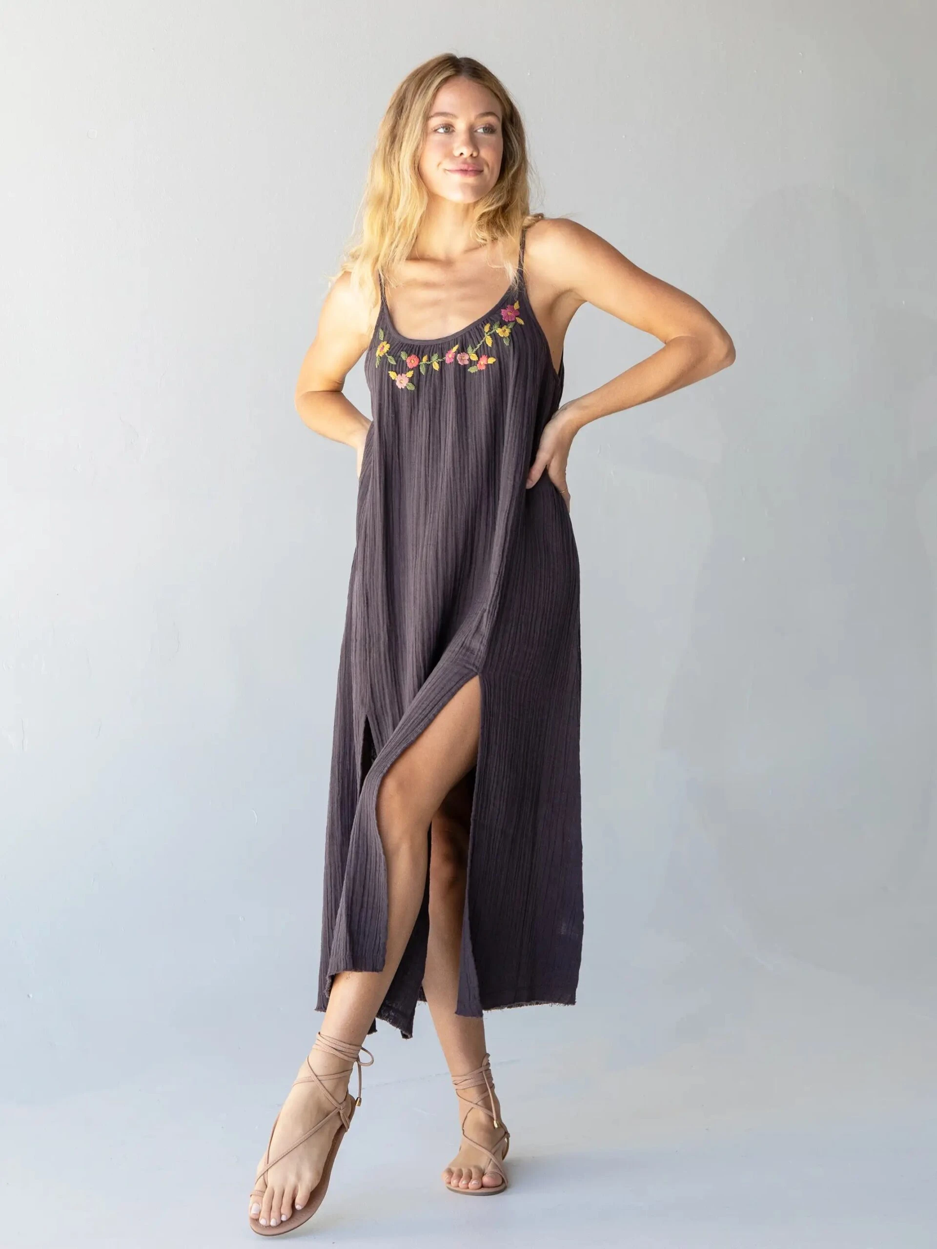 Hello summer! The Cosette Dress is the ultimate swimsuit cover-up, house dress, or out and about dress! It’s comfy, cool, and cute, of course! This super soft sleeveless dress has a raw edge hem, double front slits, and is made from a double layer of gauzy loveliness — muslin gauze has the best texture! The dark fabric is a great contrast to the garland of embroidered flowers at the neckline — so cute!!