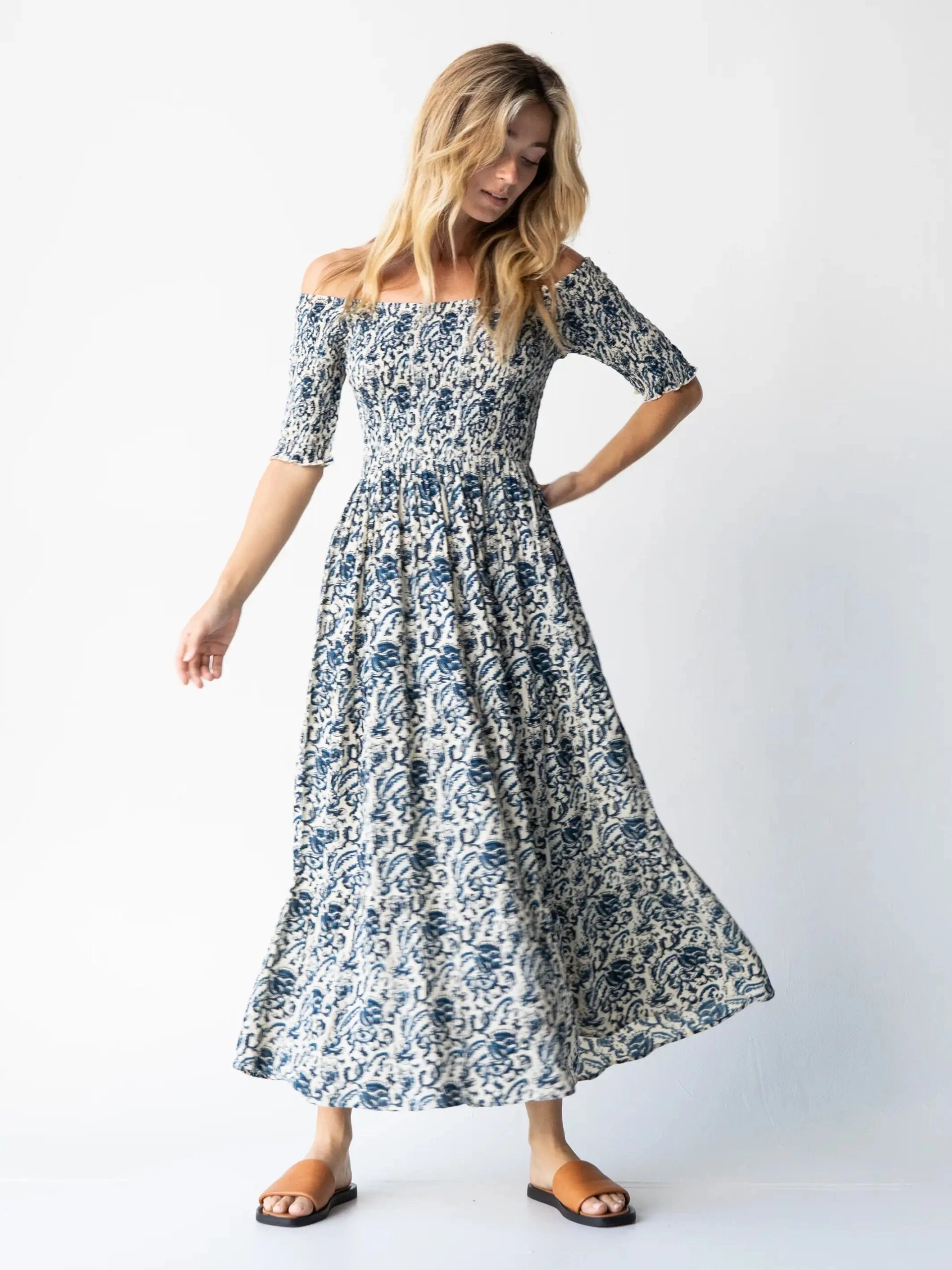 Meet Daisy – a flattering blend of fun and femininity! The bodice and sleeves are completely smocked while crinkly fabric flows to midi length. Dress Daisy up or down for a day or night event. The bonus is that you can wear this beauty on your shoulders or like an off-shoulder dress! You’ll feel simply lovely in this floral midi dress!