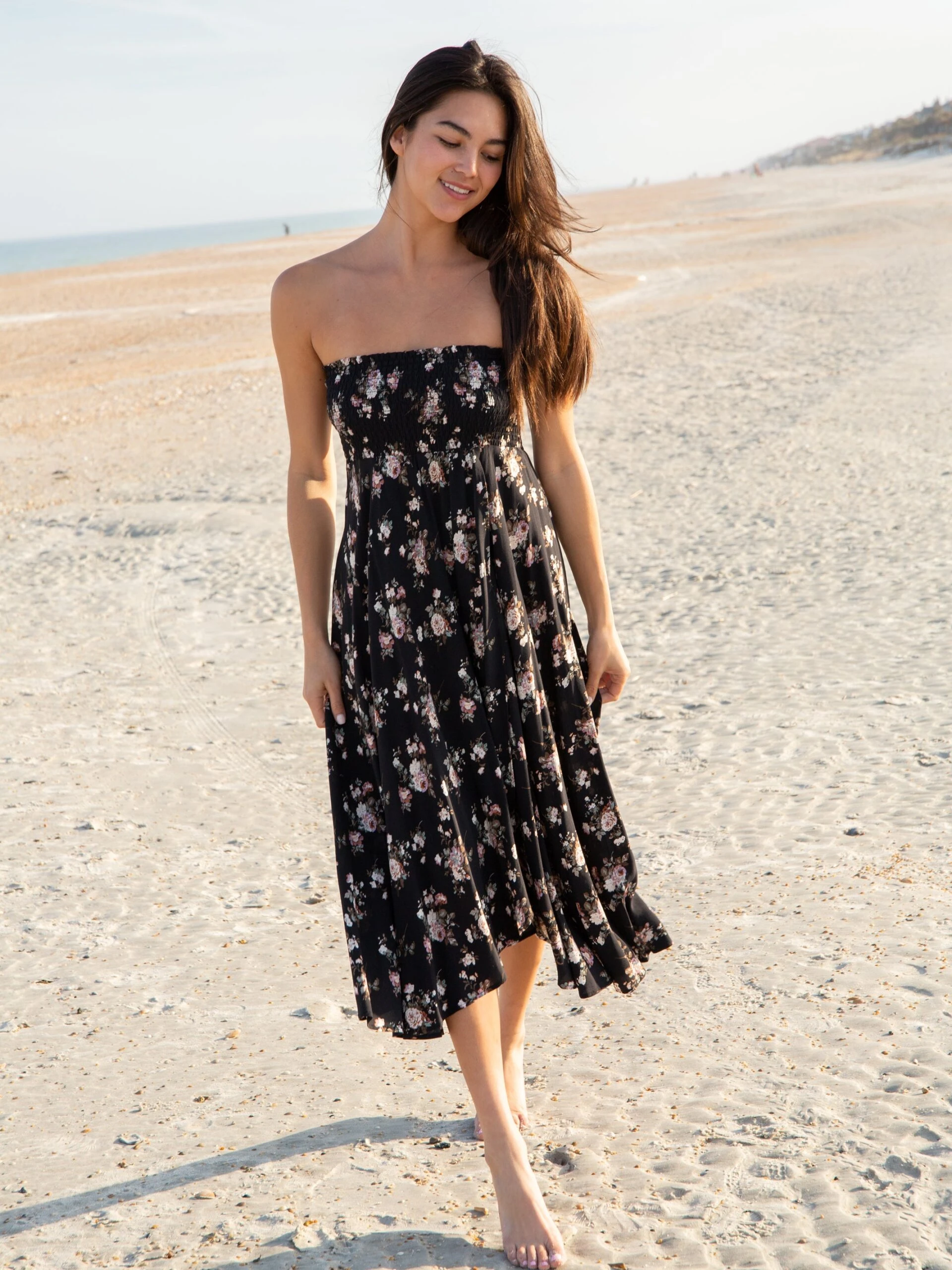 We’re obsessed with the Favorite Convertible Skirt! The extra-wide smocked waistband is SO flattering and SO comfy, and the faux wrap has a fun and flirty front slit! Then… it cascades to maxi length, BUT we didn’t stop there! It’s also a DRESS — a gorgeous floral strapless dress for summer fun! How many outfits can you get out of this one boho convertible dress? A LOT!