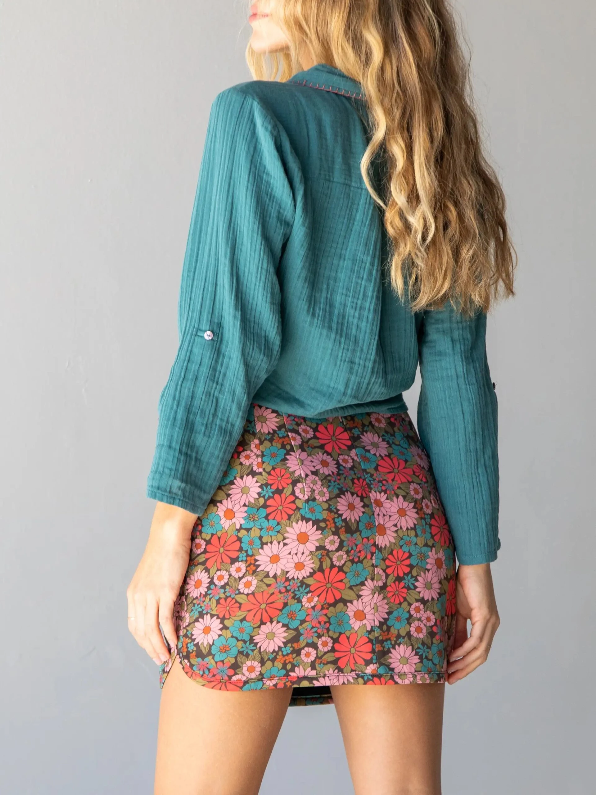 What if you could find a cute floral mini skirt that is super comfortable, flattering, AND fun – PLUS it doesn’t wrinkle? You just did! The Rachel Skirt’s smooth, soft fabric almost feels like neoprene but is crazy comfy! Its versatile, fun style will help you create many outfits! Sneakers, Birks, or even boots! Tees, cropped tops, or a gauzy button-up! You can even throw it on over your bathing suit! Let the fun begin!